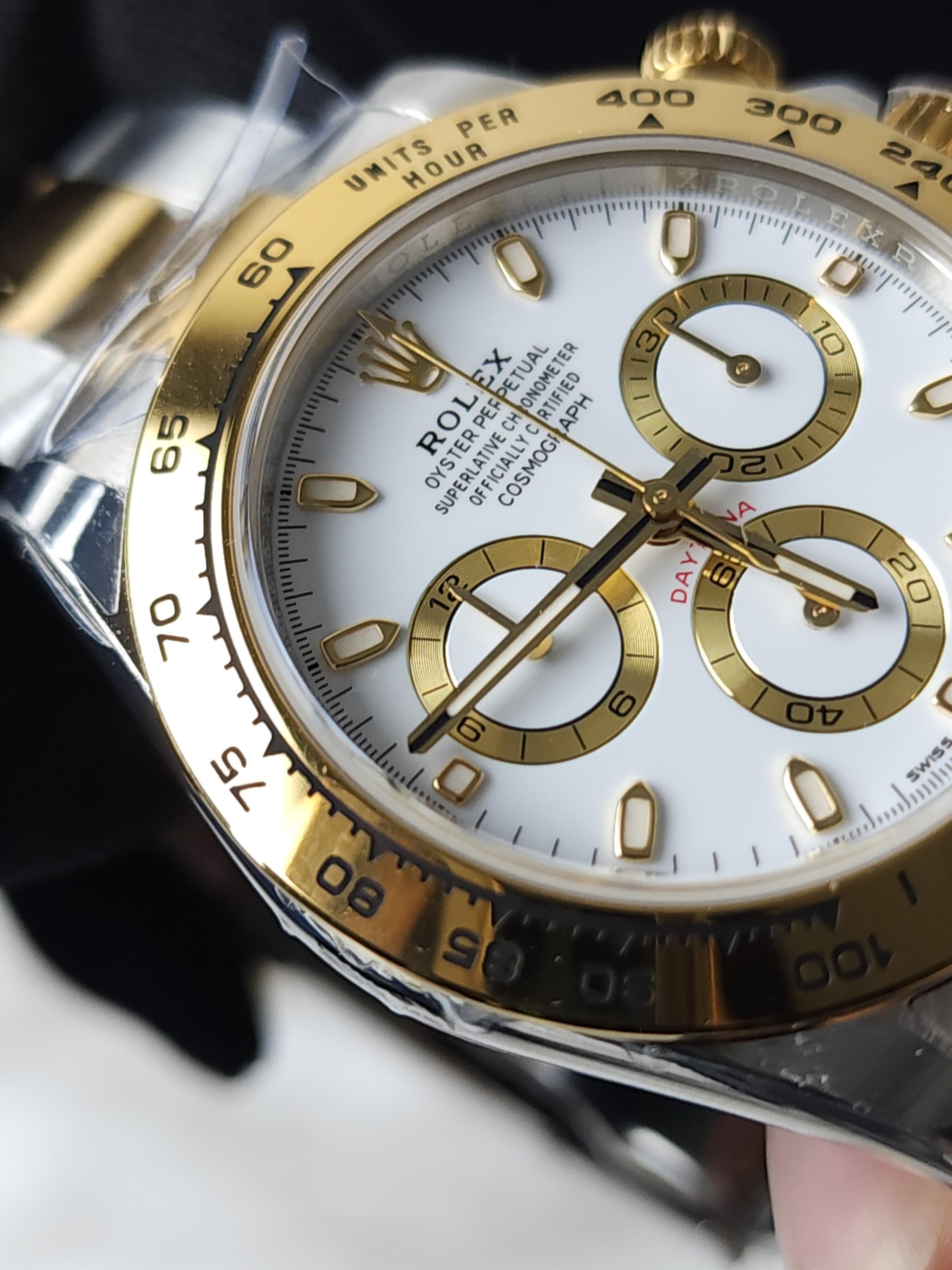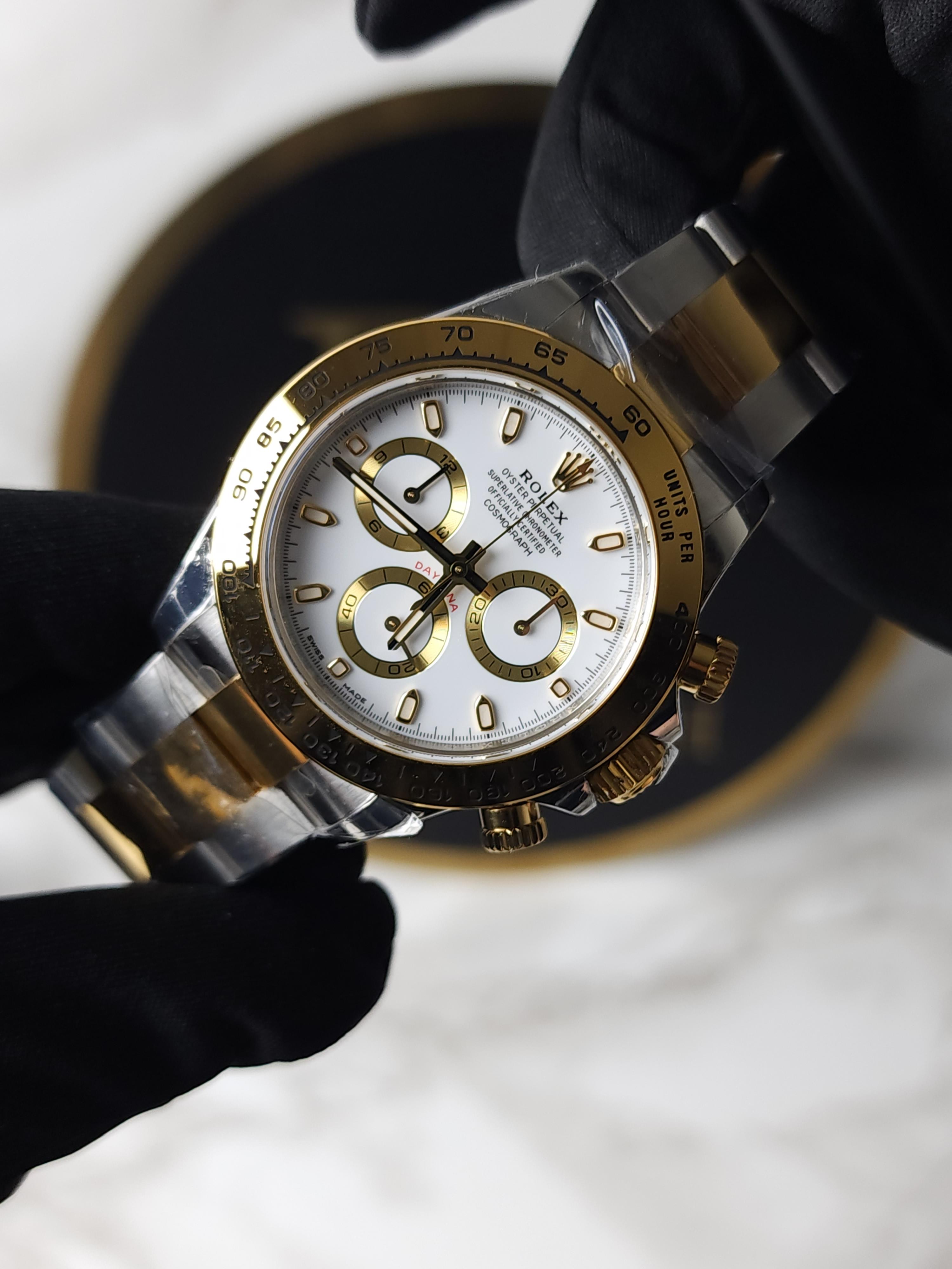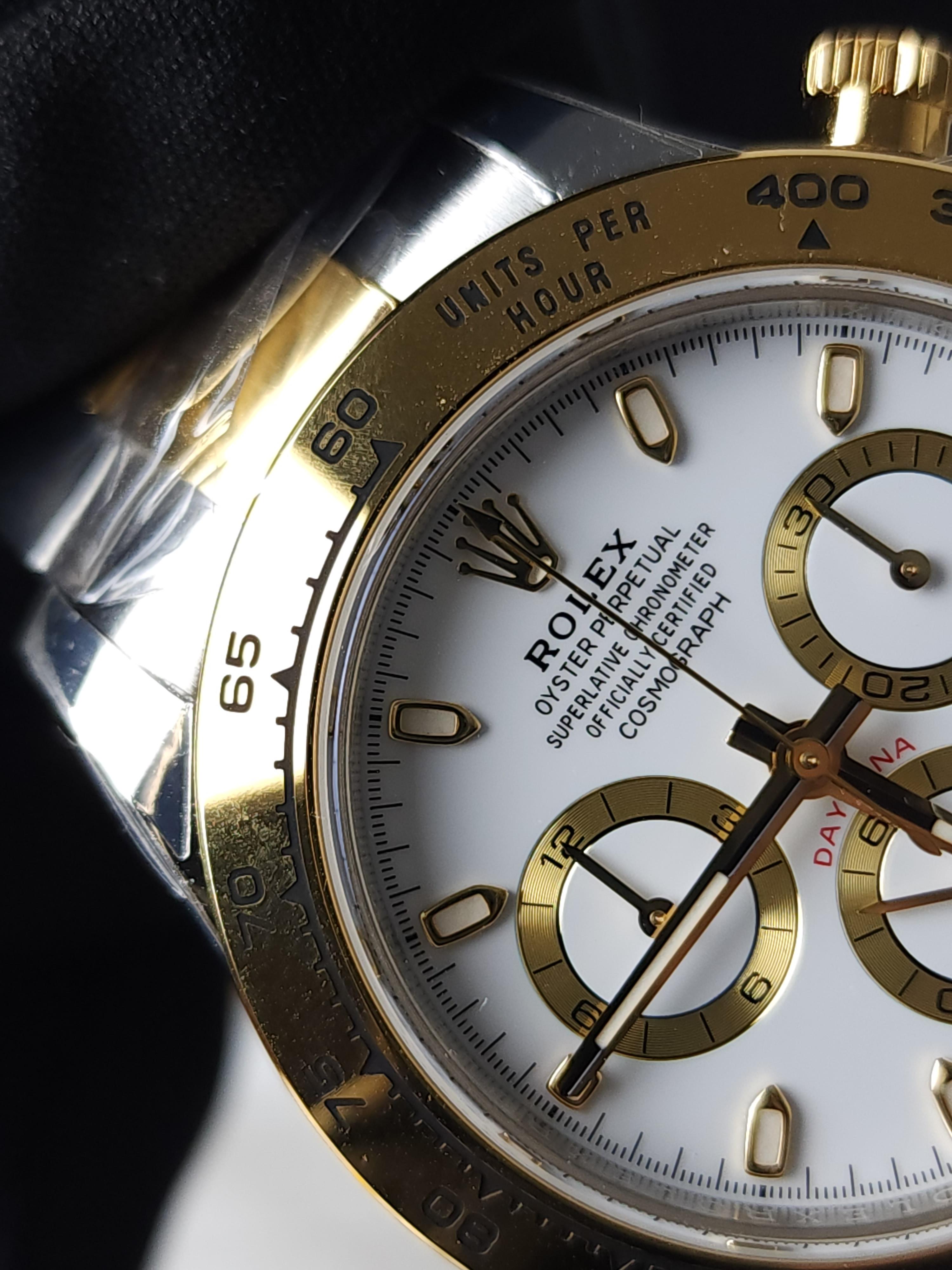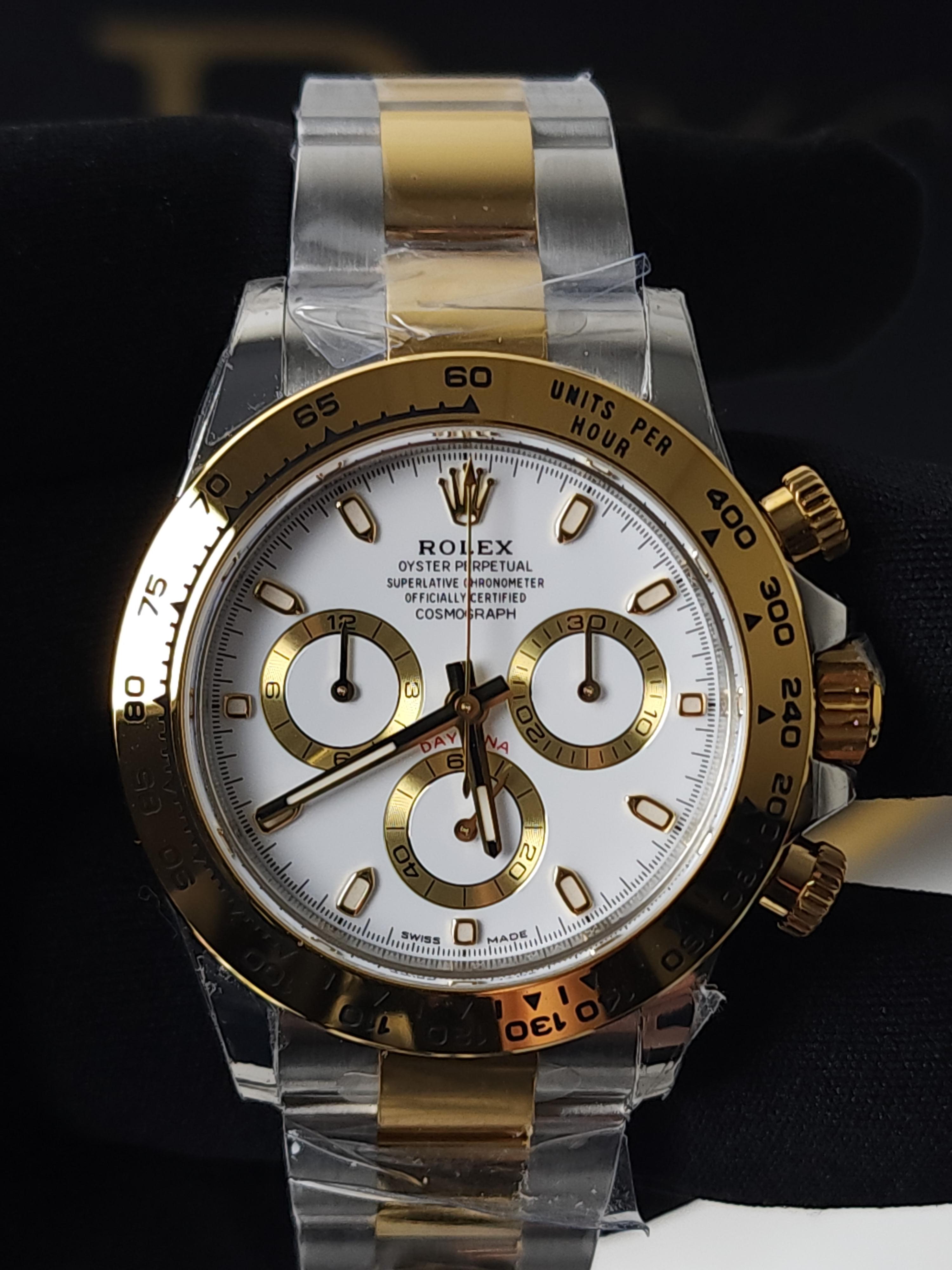 개요: 로렉스 데이토나 116503은 데이토나 컬렉션에서 유명한 모델로, 세련된 디자인과 높은 성능으로 잘 알려져 있습니다. 이 모델은 스테인리스 스틸과 옐로우 골드가 조합된 디자인으로, 로렉스에서 "Rolesor"라고 부르는 스타일입니다. 이 모델의 다이얼은 화이트 컬러로 되어 있습니다.