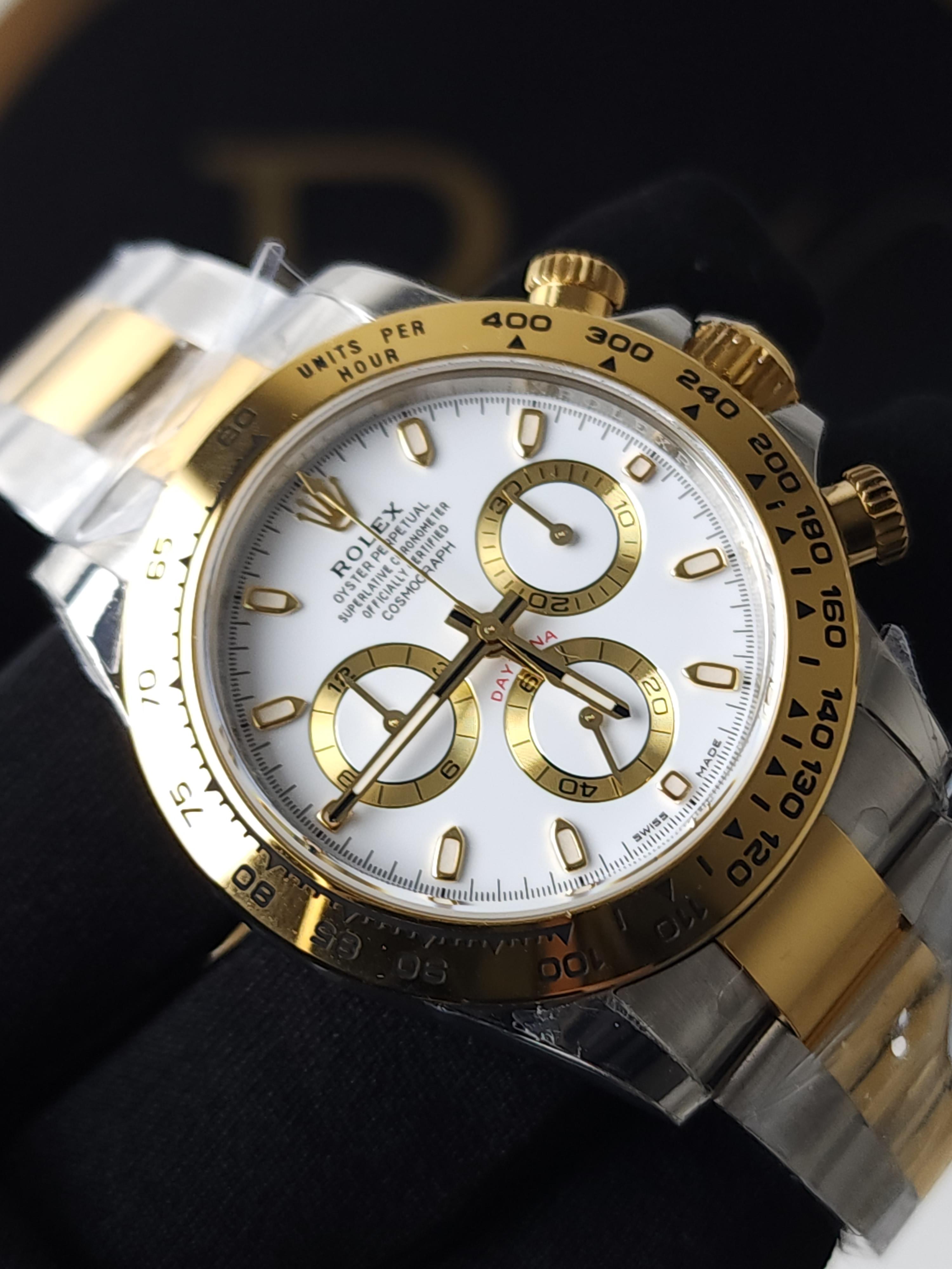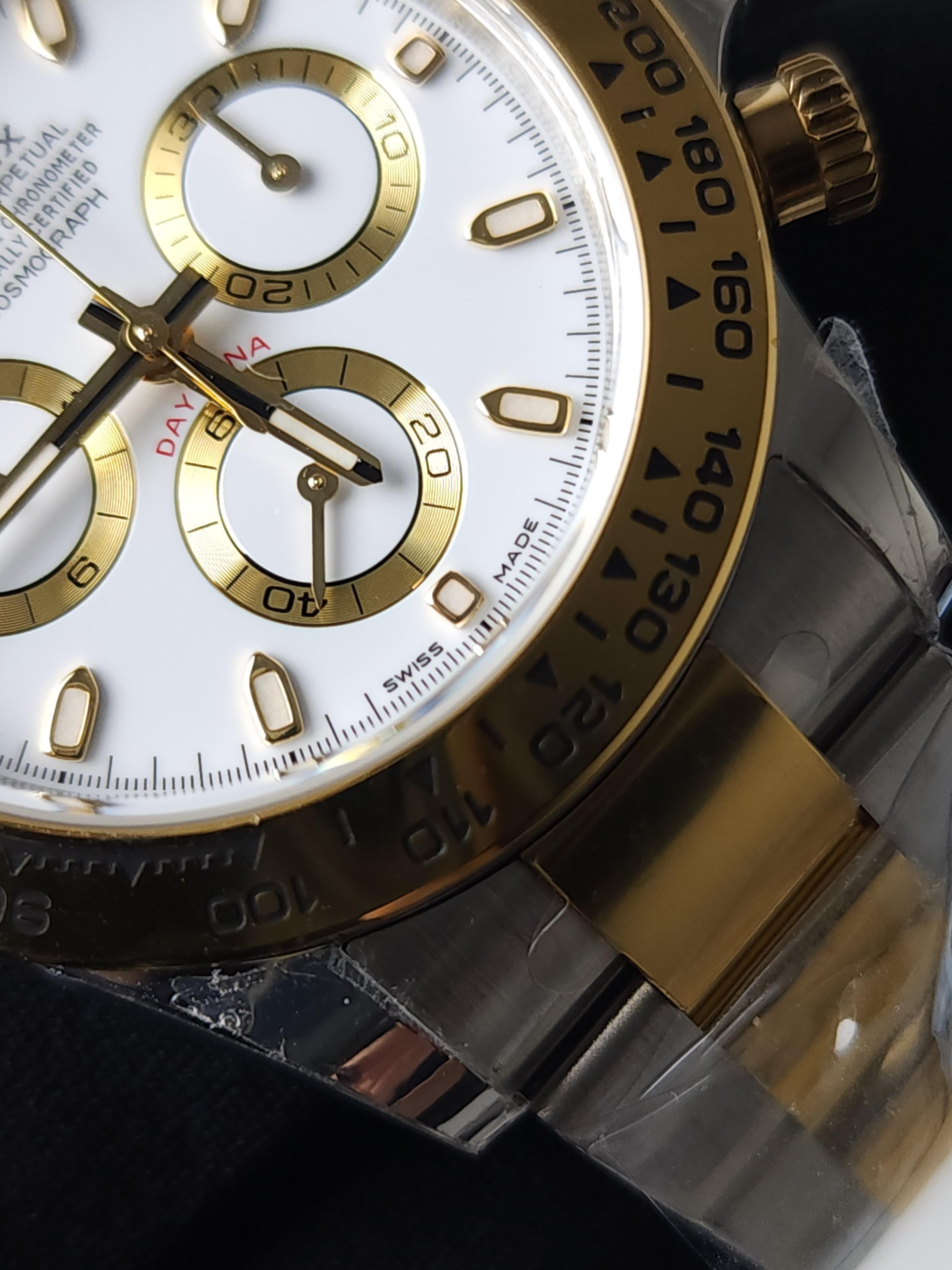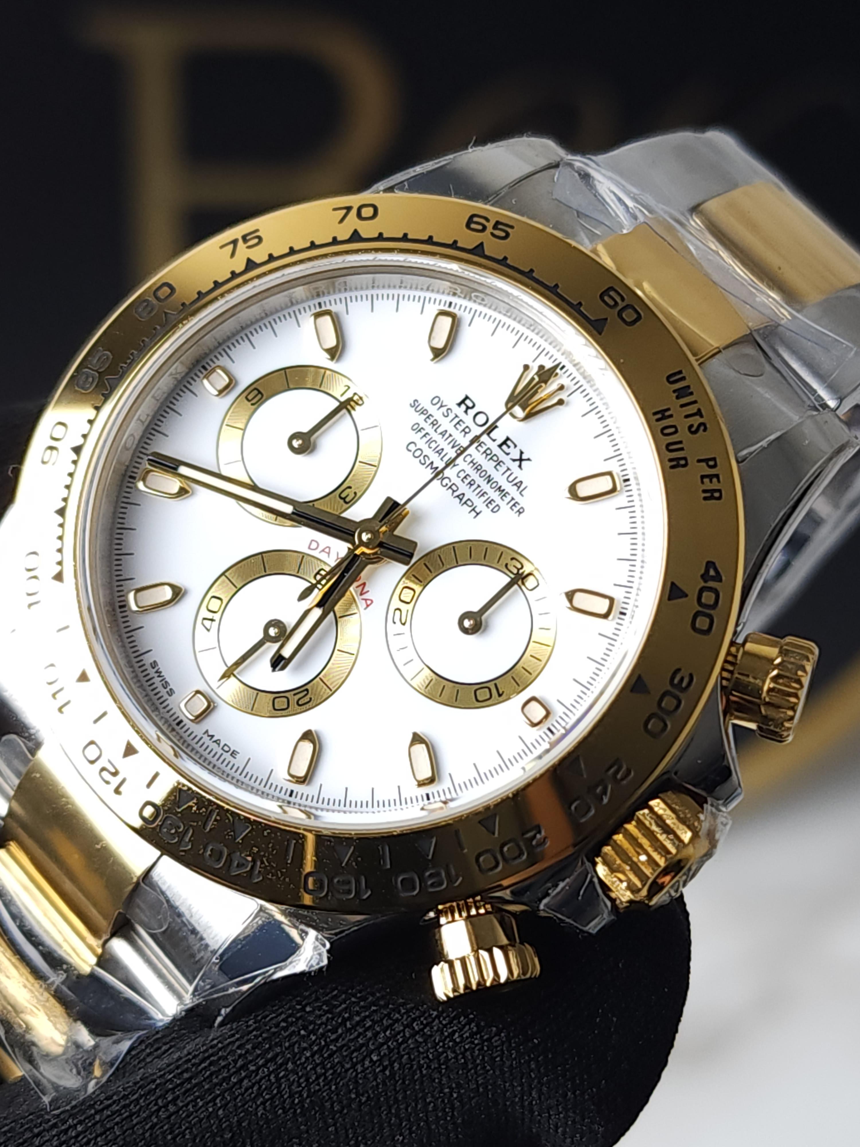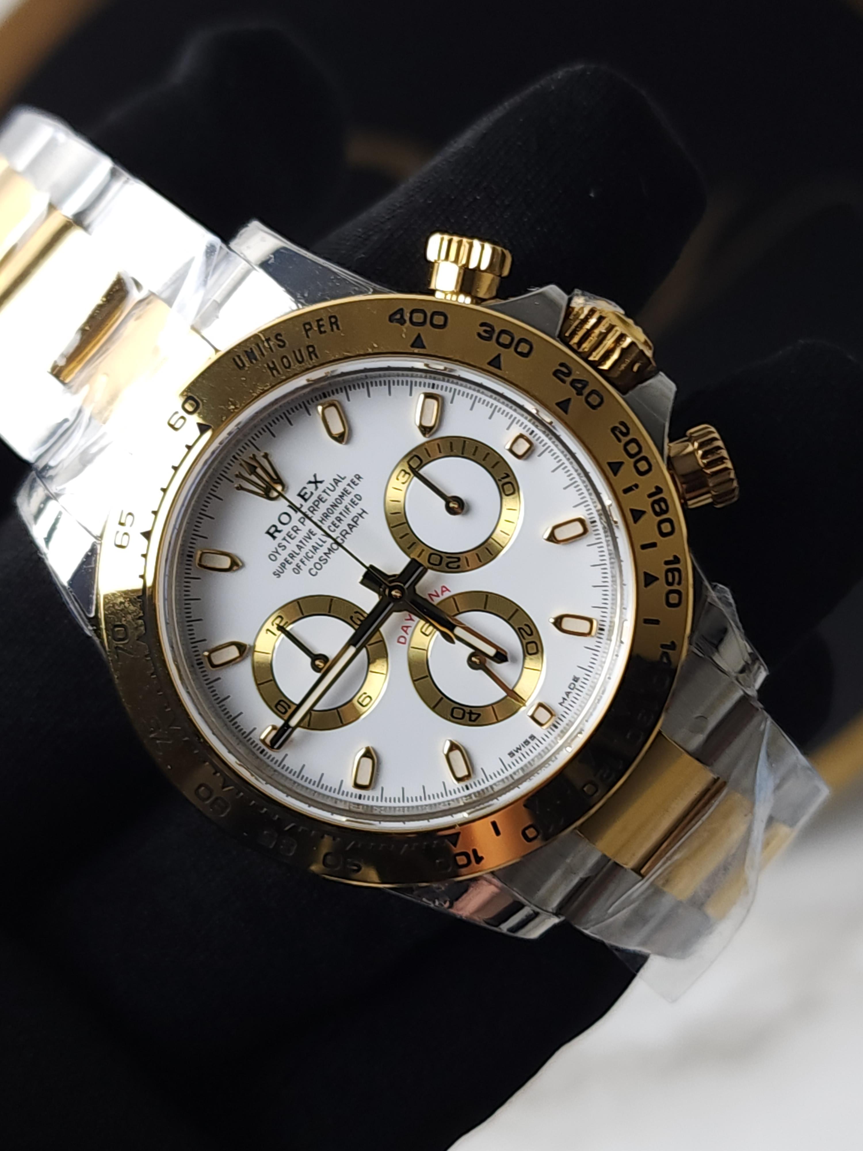 개요: 로렉스 데이토나 116503은 데이토나 컬렉션에서 유명한 모델로, 세련된 디자인과 높은 성능으로 잘 알려져 있습니다. 이 모델은 스테인리스 스틸과 옐로우 골드가 조합된 디자인으로, 로렉스에서 "Rolesor"라고 부르는 스타일입니다. 이 모델의 다이얼은 화이트 컬러로 되어 있습니다.