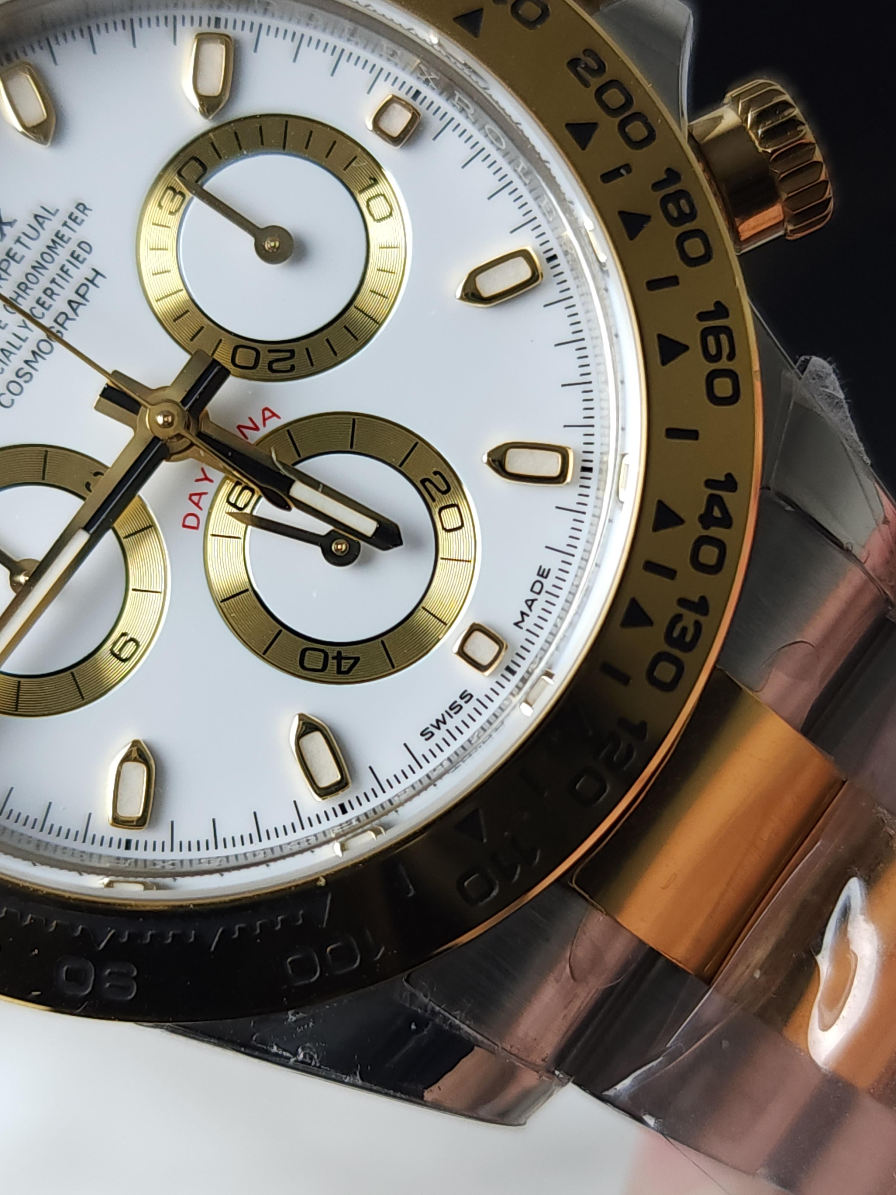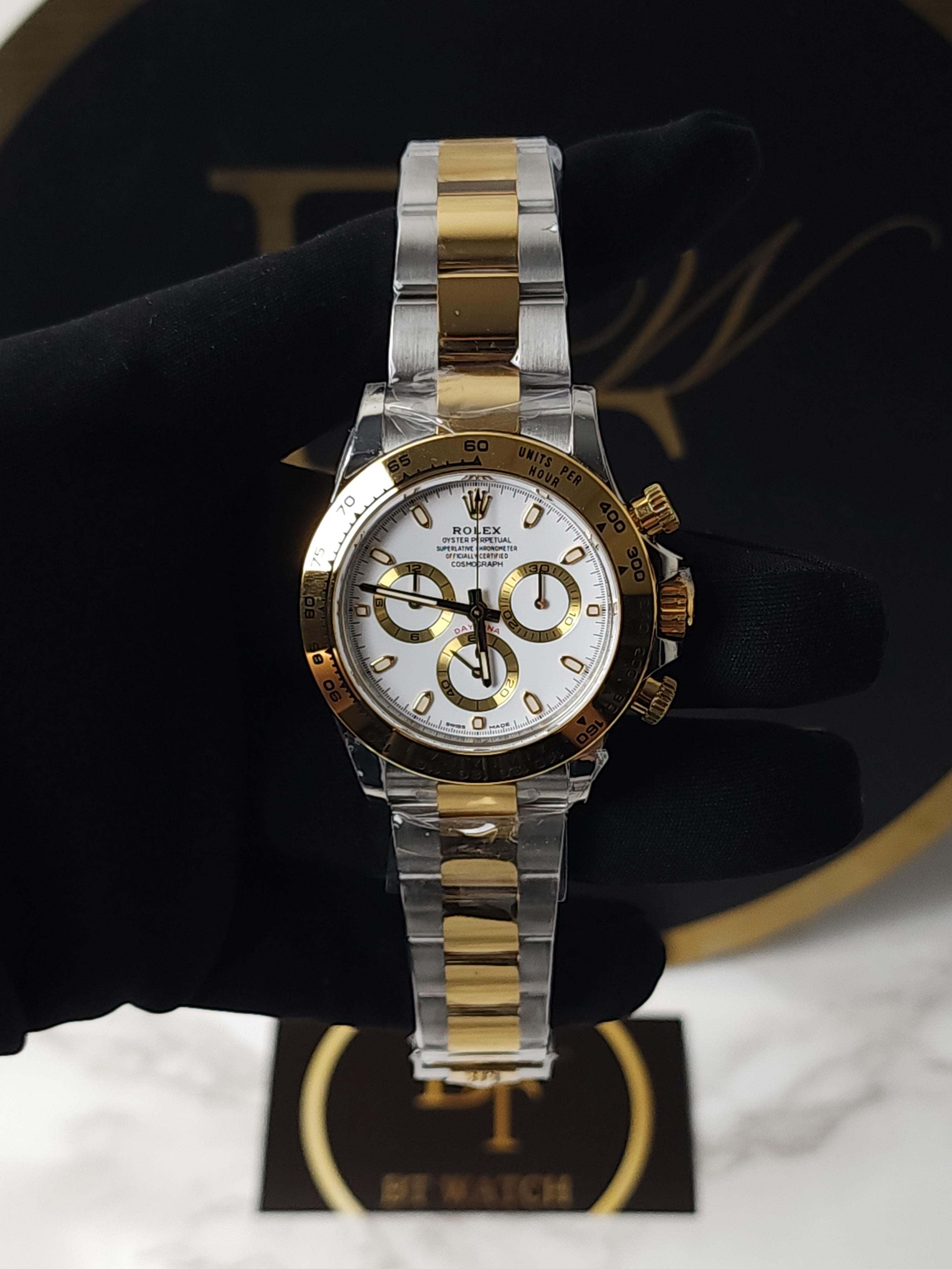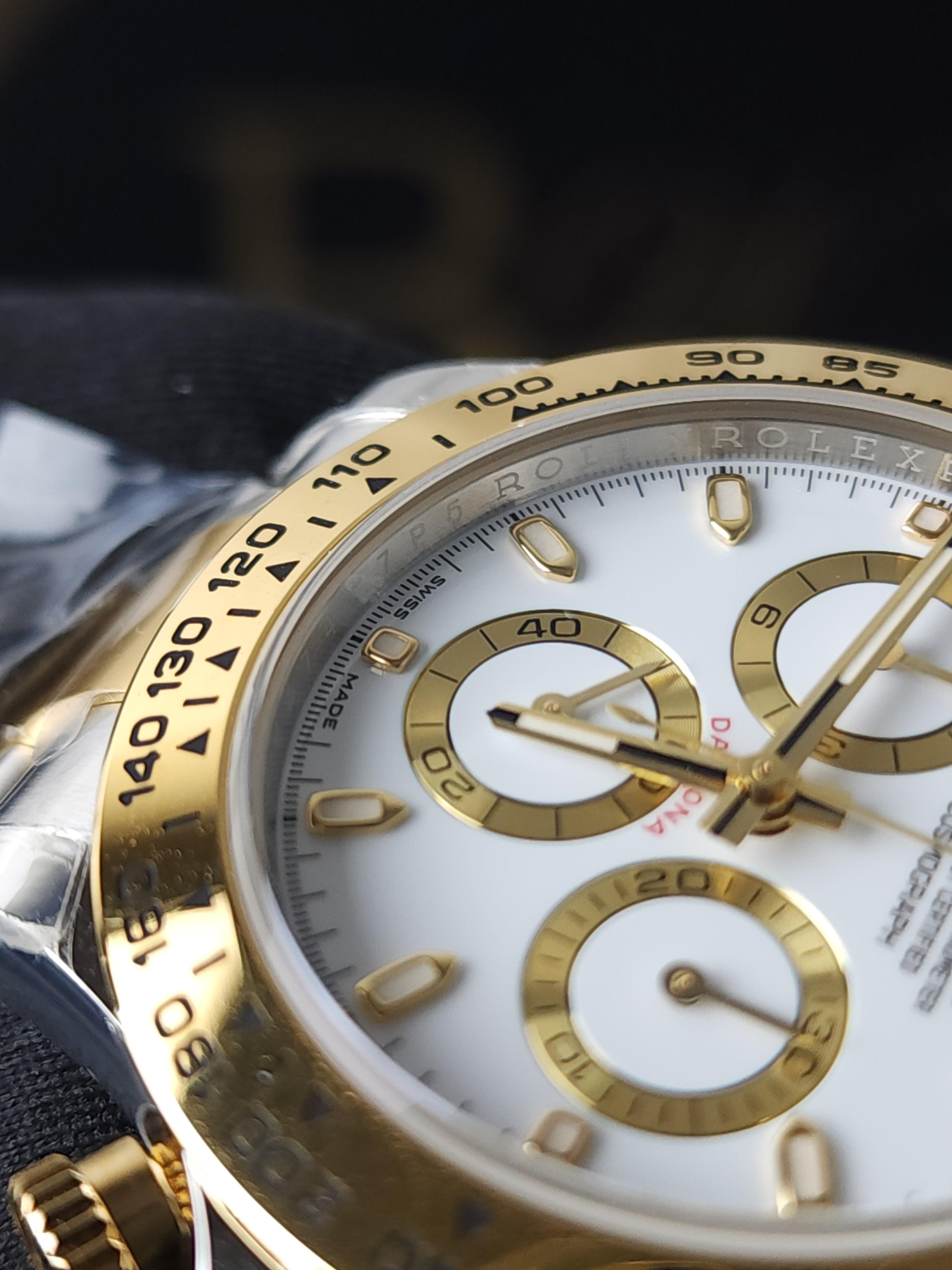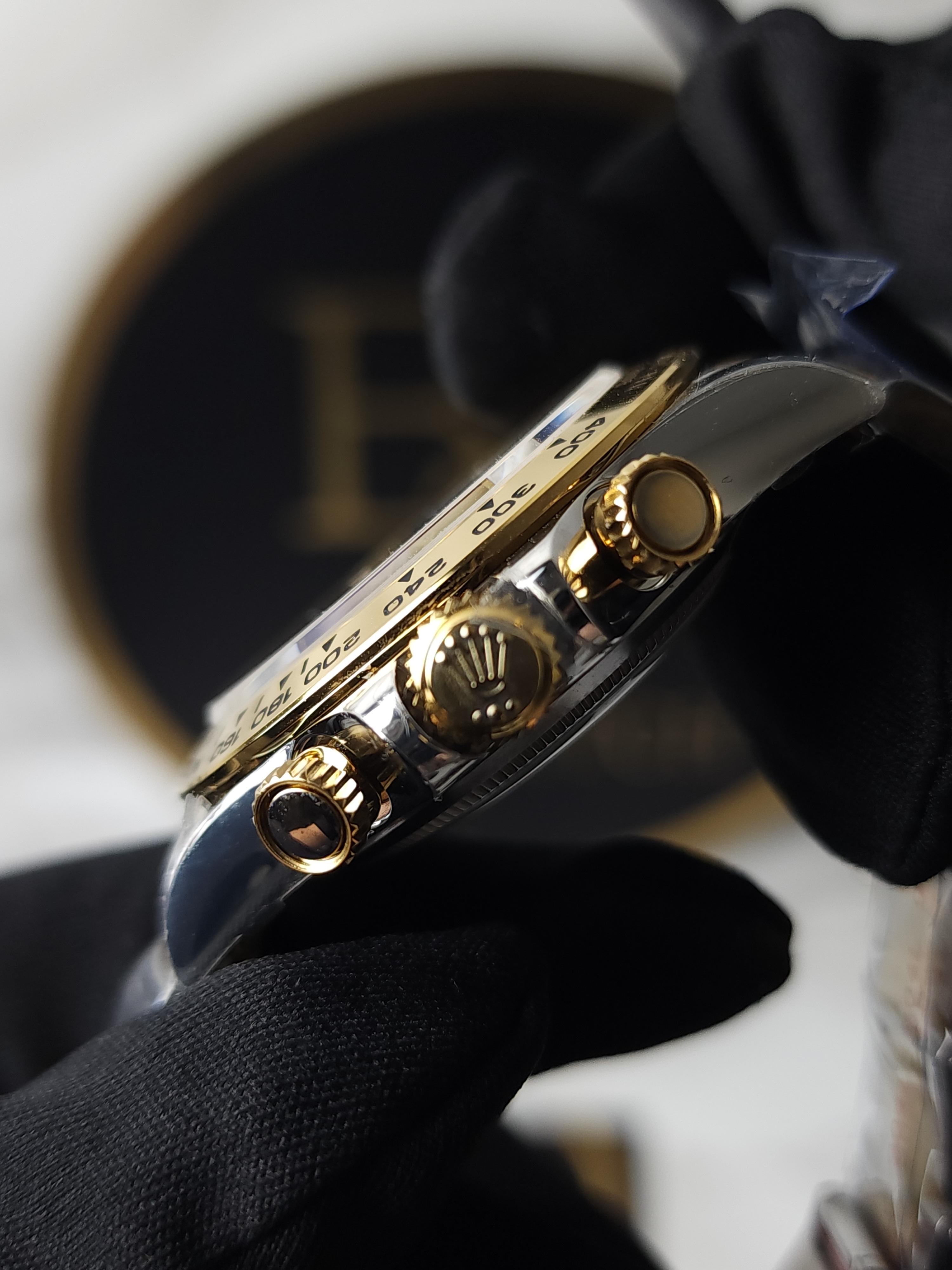 개요: 로렉스 데이토나 116503은 데이토나 컬렉션에서 유명한 모델로, 세련된 디자인과 높은 성능으로 잘 알려져 있습니다. 이 모델은 스테인리스 스틸과 옐로우 골드가 조합된 디자인으로, 로렉스에서 "Rolesor"라고 부르는 스타일입니다. 이 모델의 다이얼은 화이트 컬러로 되어 있습니다.