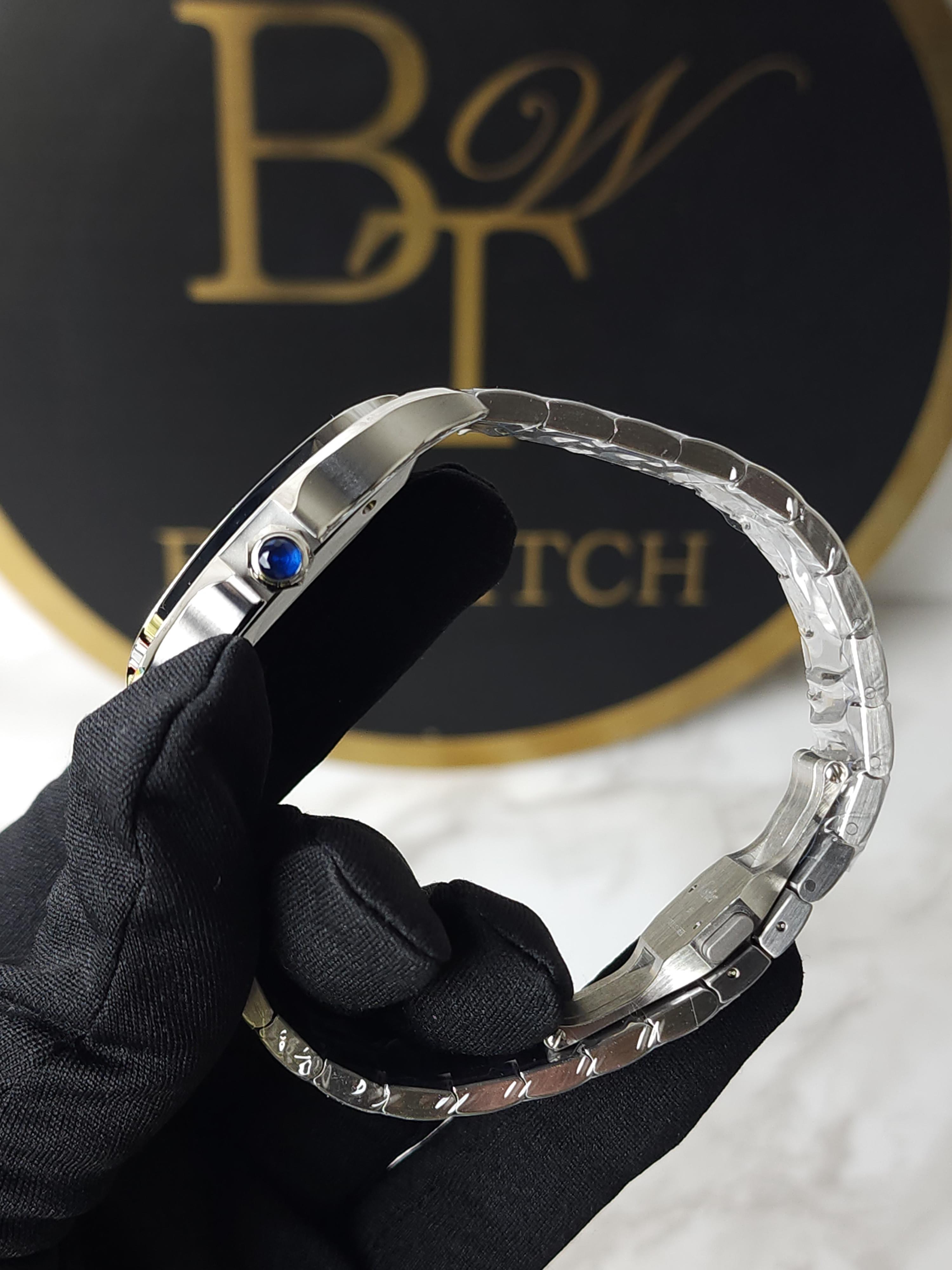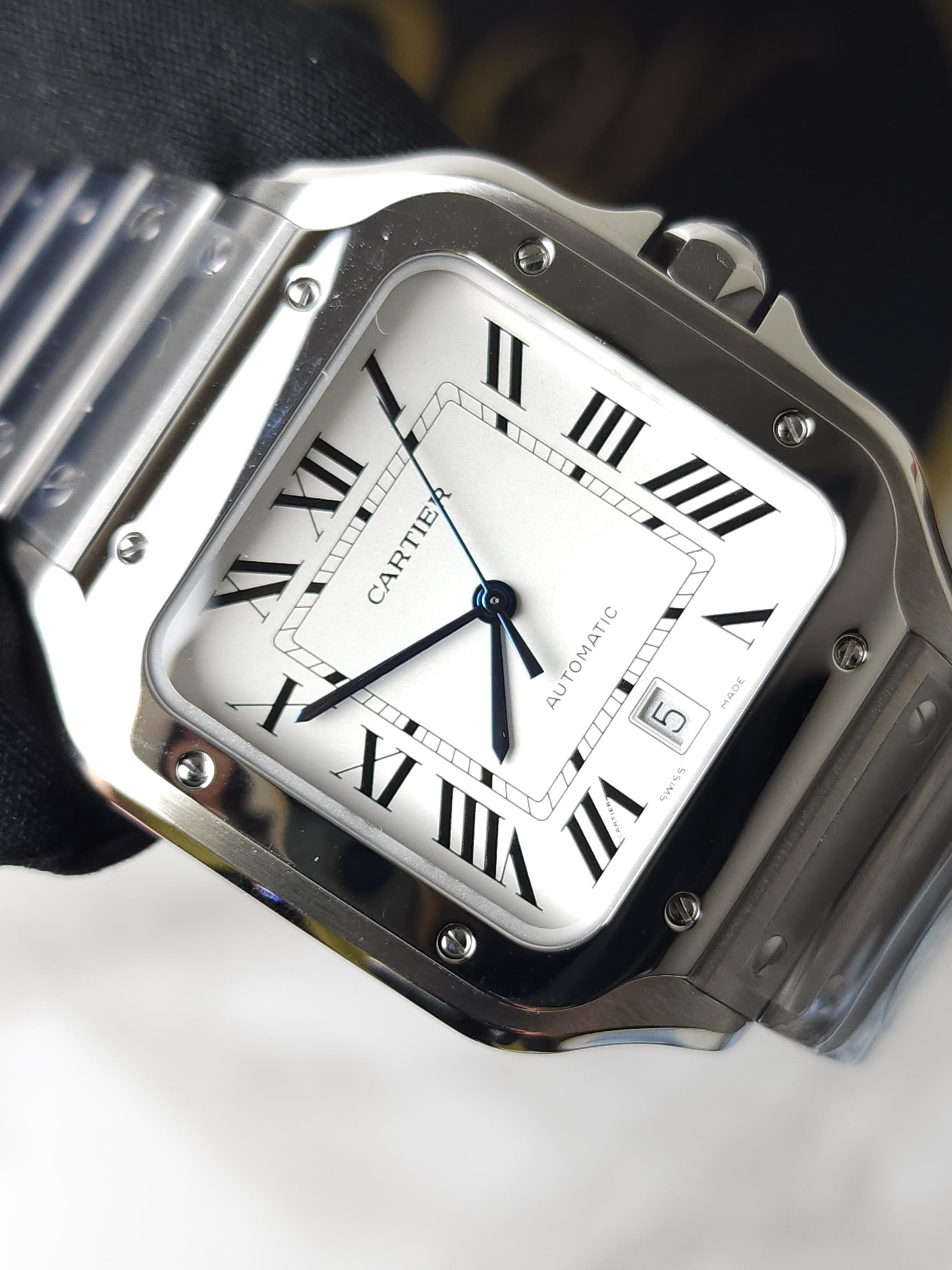 - 사이즈와 착용감 까르띠에 산토스 라지 모델의 정품과 동일한 39.8mm x 47.5mm 크기를 충실히 재현하였으며, 두께도 9.08mm로 매우 얇게 제작되었습니다.