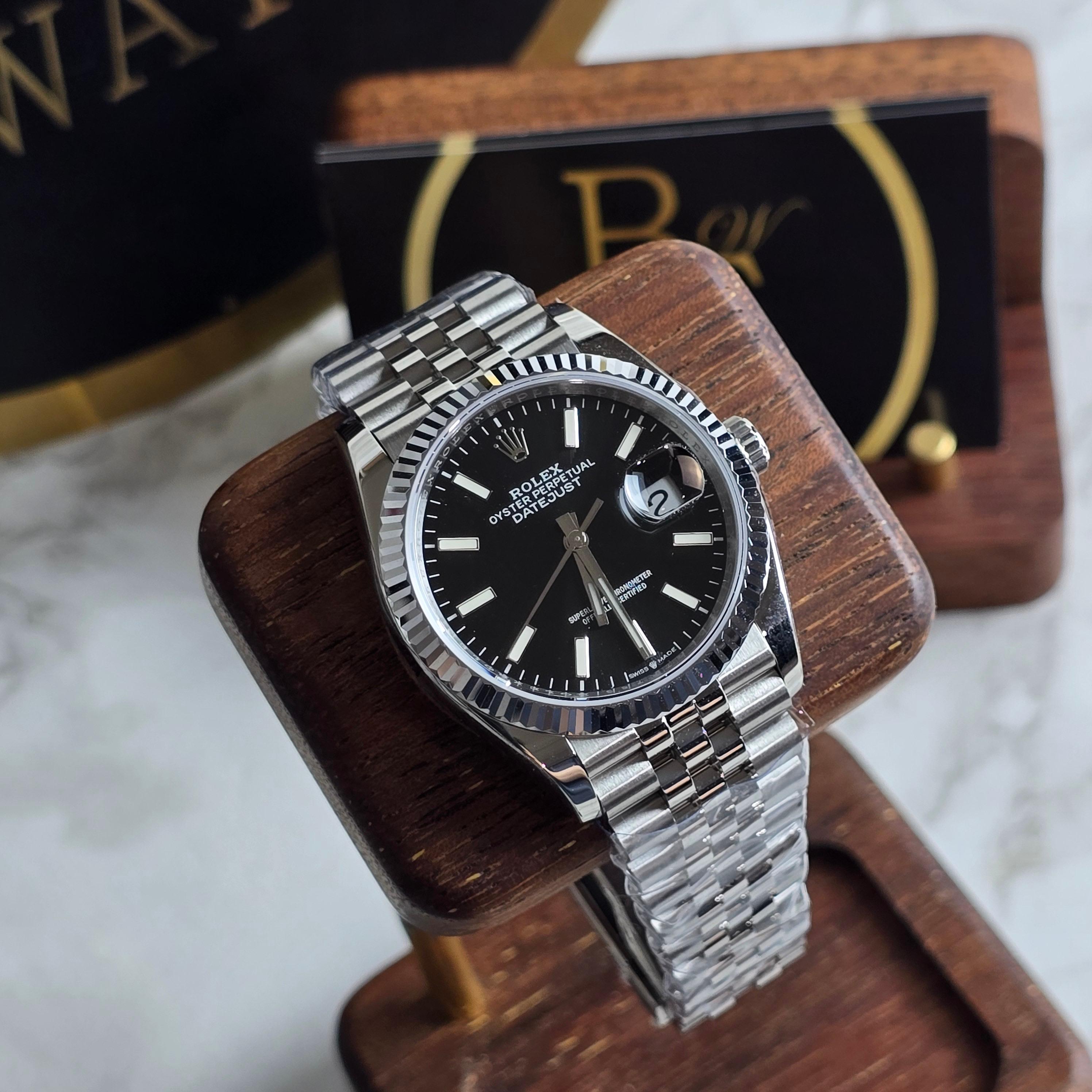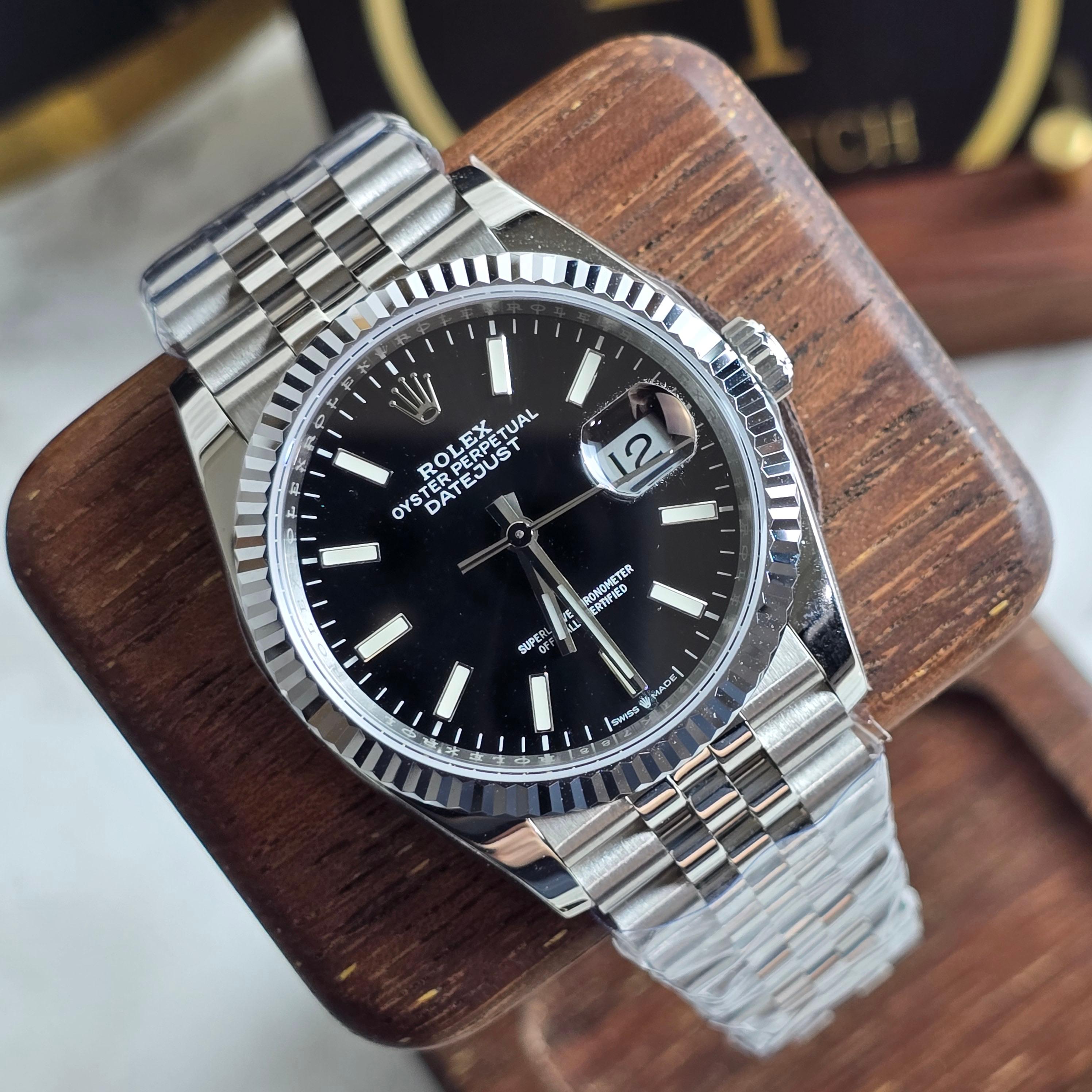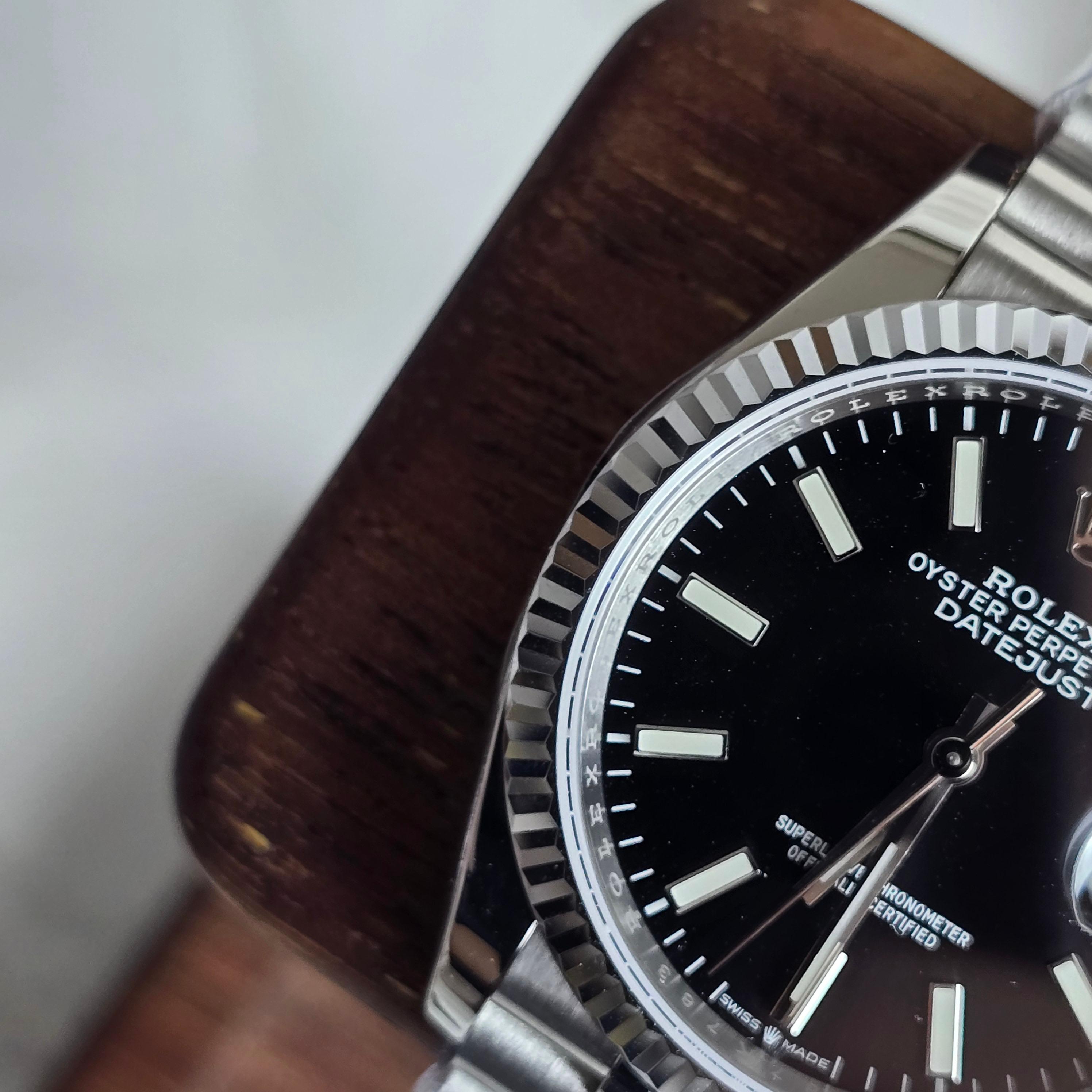 클린공장에서 제작한 이 36mm 블랙 다이얼 데이저스트는 마감 퀄리티와 디테일 구현력에서 높은 평가를 받는 제품입니다. 블랙 다이얼은 깔끔하고 고급스러운 인상을 주며, 야광 인덱스와 핸즈의 디테일도 매우 정밀하게 제작되어 있습니다.