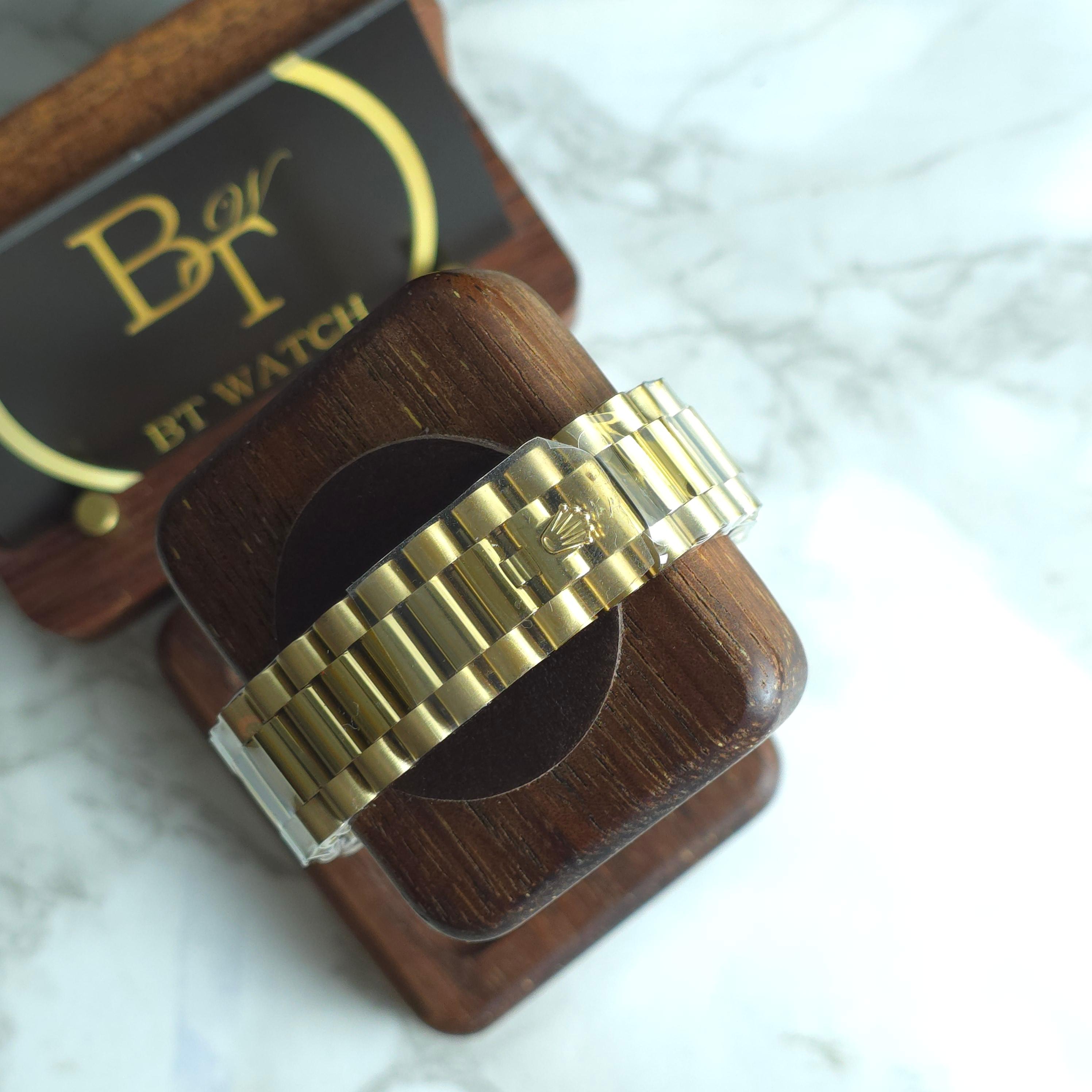 GM 공장은 데이데이트의 케이스 라인과 브레이슬릿 디테일을 충실히 재현했습니다. 플루티드 베젤의 각도와 빛 반사가 자연스럽고, 브레이슬릿 링크도 곡선이 매끄러워 손목에 부드럽게 감깁니다.
